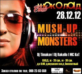 НК "ШОКОЛАД" c гордостью представляет –САМУЮ ЛУЧШУЮ квинтэссенцию хорошей музыки и отличного настроения, с лаконичным названием «MUSH UP». Всю ночь ДИ-ДЖЕИ будут дарить вам свои любимые треки и делать потрясающие музыкальные сюрпризы, алкоголь будет литься рекой, а позитивный заряд, полученный на данном мероприятии, не покинет вас еще долгое время!!!