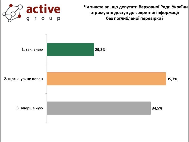 Щодо обізнаності громадян про те, що народні депутати вже отримують доступ до секретної інформації без поглибленої перевірки, то лише 29,8% респондентів відповіли, що знають про це. Найбільше – 35,7% – щось чули, але не впевнені, а ще 34,5% вперше чують про такий факт.